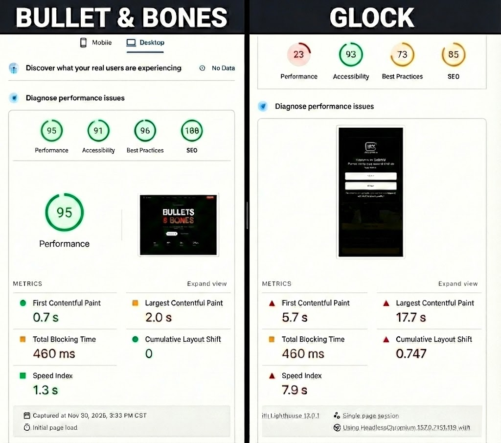 Glock's website: 7.9 seconds to load. Google Score: 23/100 🐌