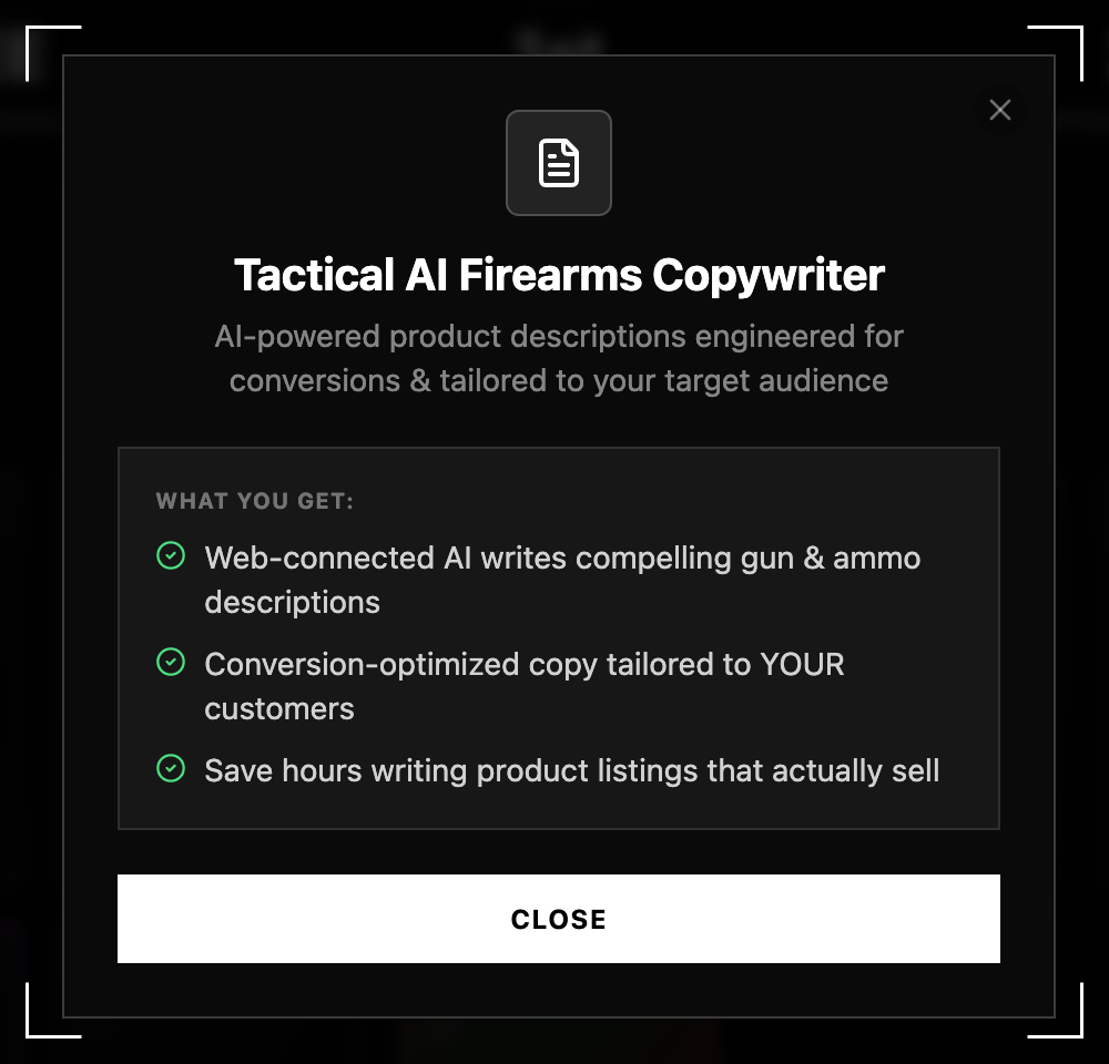 - This AI writes compelling gun and ammo descriptions that convert browsers into buyers, precisely tailored to YOUR audience. You'll save hours and watch your sales soar.